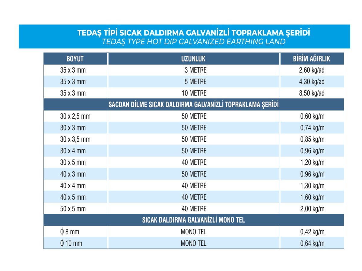 Galvanizli Sıcak Daldırma topraklama şeritleri; özellikle temel topraklamasında betonarme ile aynı esaslı malzeme olduğundan ve korozyon riski taşımadığından en uygun malzemedir. Önceleri 4-6 m’lik galvanizli şerit kullanılırken, günümüzde daha çok 20-30 m’lik şeritler tercih edilmektedir. Boy kısaldıkça daha fazla ek malzemesi gerekmesi, bunun da işçiliği ve maliyeti arttırması bu tercihte en önemli etkendir. Çok ek çok problem demektir.